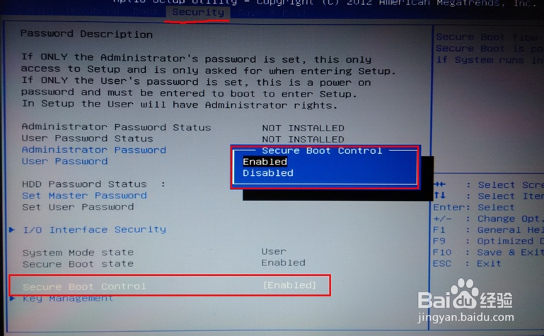 在主菜单Secure/Security目录下,选择Secure Boot Control 把它设置为Disabled,即可。