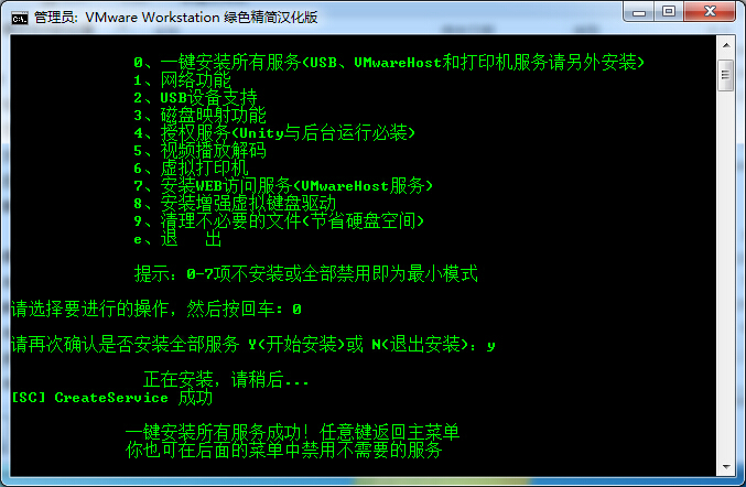 选择需要安装的组件,一般直接选择数字0“一件安装所有服务”然后按字母Y确认安装即可