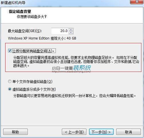 为虚拟机分配磁盘大小,即虚拟机系统一共占用的系统大小,这里小编设置为20G,同时将如图“立即分配所有磁盘”前的方框勾选上