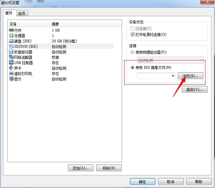 在虚拟机设置界面左侧鼠标移动点击到CD/DVD(IDE),然后在右侧的链接下选择系统读取的路径,如果你是用光驱+光碟就选“应用物理驱动”,应用下载好的ISO镜像就选下面的“应用ISO镜像”并浏览文件夹选择,这里以后者为例