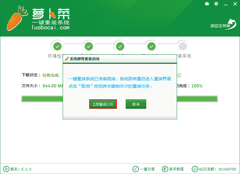 点击后软件进入系统的下载界面,此时您可以稍作休息或者将软件最小化到系统栏后做其他工作,待下载完毕后就会提示“立即重启”落后入系统安装界面。