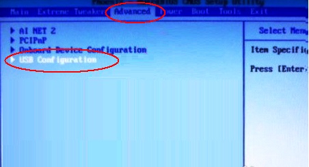 2.进入后按键盘上的右方向键找到“Advanced”选项,最下面项是“USB Configuration”,用高低方向键选择它,回车进入: