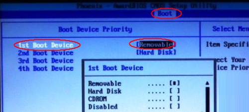 5.然后在“Boot Devicepriority”设置界面下选择第一项“1st Boot Device”并按回车。然后在弹出的“1st Boot Device”选项中选择第一项“Removable”(移动装置):