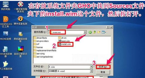 5、会打开一个文件选择框,找到先前在D盘建立的GHO文件夹,然后找到其子文件夹Sources,然后再在Sources文件夹下找到install.wim这个文件,这个就是安装文件,选出好后按“打开”按钮。