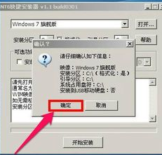 7、在这里,弹出安装前最后一个确认窗口,仔细看一看,如果断定都选择好了,就可以点按“断定”,安装开端。