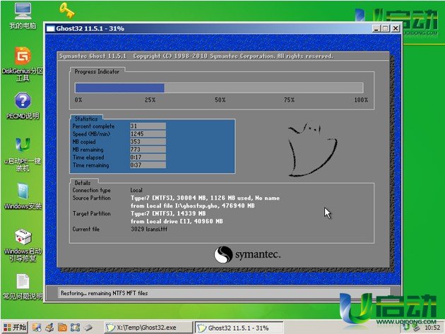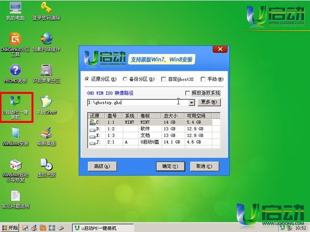 2、在u启动的主菜单界面上将光标移至“【02】运行u启动win2003PE加强版(装机推荐)”并按下回车键即可进入win2003PE系统,进入PE系统后双击运行桌面上的“u启动PE一键装机工具”,程序会主动检测各磁盘中存在的系统镜像文件并且显示出来以供选择,此时找出我们在老鸟Win10升级助手前所筹备的系统镜像文件,选取完系统镜像文件后接着就要选择老鸟Win10升级助手时所需的硬盘分区空间,一切选择完毕后点击“断定”按钮即可;如下图所示: