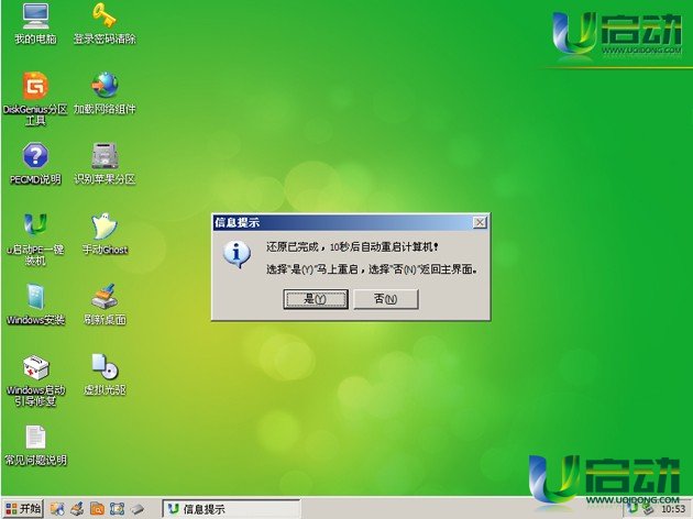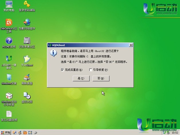 3、随后在弹出的“UQDGhost”的提示窗口中点击“是”按钮即可;如下图所示: