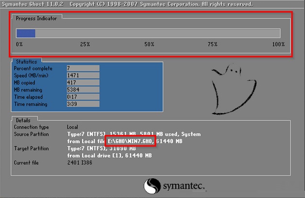 点击断定按钮后,则是会弹出备份重启的界面,然落后入ghost还原界面对系统进行备份。