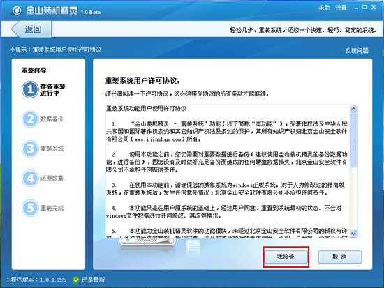 第一步:打开“金山装机精灵”,选择“重装系统”,进入系统重装界面,第一次应用电脑重装系统功效,需要认真浏览重装系统用户允许协议: