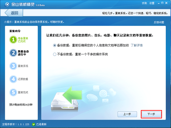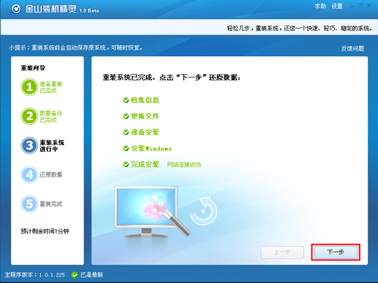 重装系统完成,电脑重启落后入桌面,主动启动金山装机精灵。点击“下一步”,进行数据还原。