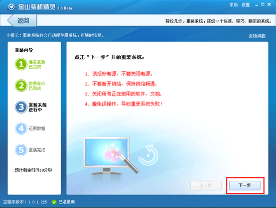 第三步:数据备份完成,进入重装系统阶段。此时请不要断开电源,保持网络链接正常,并且关闭所有正在应用的软件及文档。点击“下一步”,开端重装系统。
