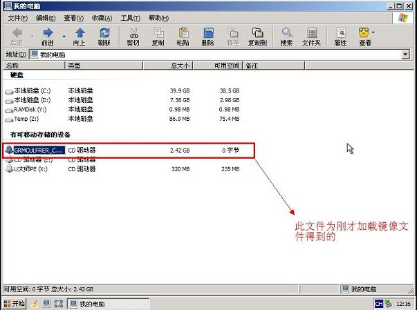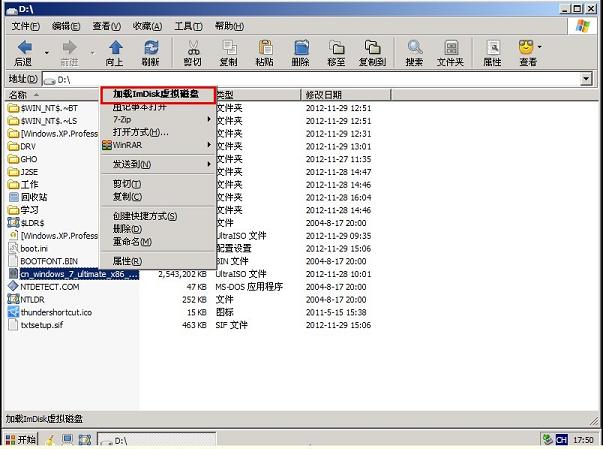 3.进入WINPE后,找到刚才筹备好的原版WIN7镜像文件,利用ImDisk将其加载成虚拟磁盘,如图: