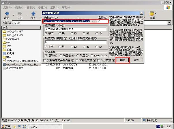 4.请记住加载后的虚拟磁盘盘符,这里为F,之后点击断定按钮