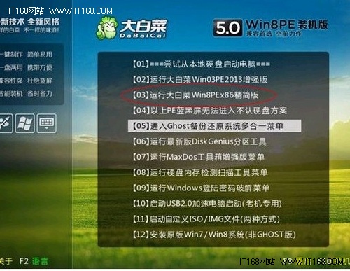 4、 成功从U盘启动后会看到大白菜U盘工具选择菜单,在这里我们选择3,进入WIN8PE系统