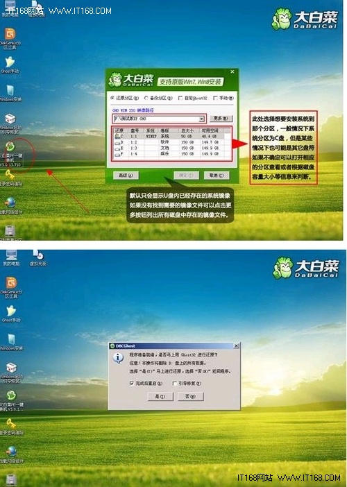5、 如果 是旧电脑 ,就是之前已经安装过系统的电脑,就直接点击桌面“大白菜一键装机”,在涌现的选项中 选择对应的系统GHO文件,点确认就可以了,一般按默认就对了。(注:如果是新电脑,就要对硬盘进入分区后,才干安装系统,运行桌面的DISKGEN软件分区即可。)