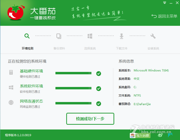 1.点击下载软件,并正常打开,点击软件首界面的“立刻重装”按钮进入检测页面,完成后点击“下一步”。