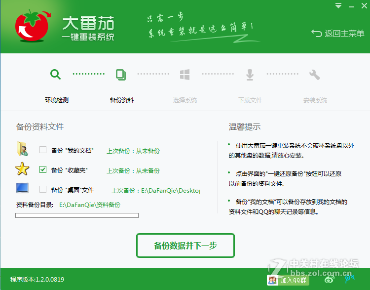 2.选中要备份的内容,点击”备份“按钮,大番茄会主动将文件备份到选中的目录下,备份完毕后点击“下一步”。