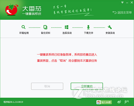 5.点击“取消”按钮取消安装或者点击“立即重启”按钮,电脑会主动重启并开端安装新系统。