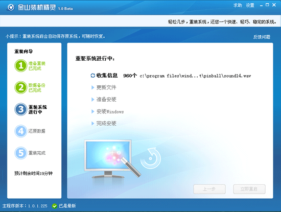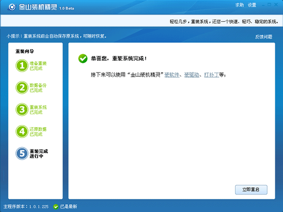 第五步:在还原数据之后,重装系统完成,此时需要您重启下电脑。另外您还可以应用金山装机精灵的其他功效:装驱动、装软件、打补丁。