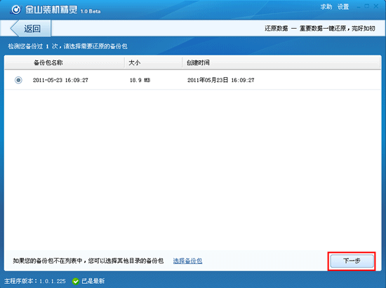 重装系统完成,电脑重启落后入桌面,主动启动金山装机精灵。点击“下一步”,进行数据还原。