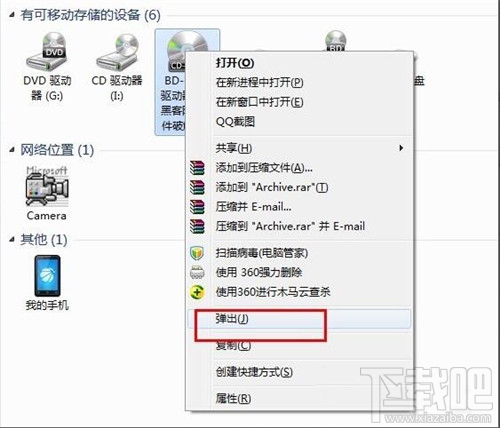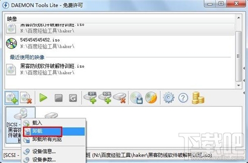 6、右击要挂载的虚拟光驱,在弹出的菜单中选择”卸载”项即可。当然,也可以直接右击“我的电脑”中对应光驱盘符选择“弹出”操作来实现同样的操作;