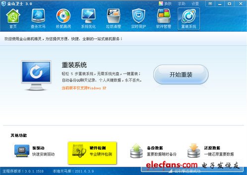 1.首先下载金山卫士,打开卫士主界面中“重装系统”标签,