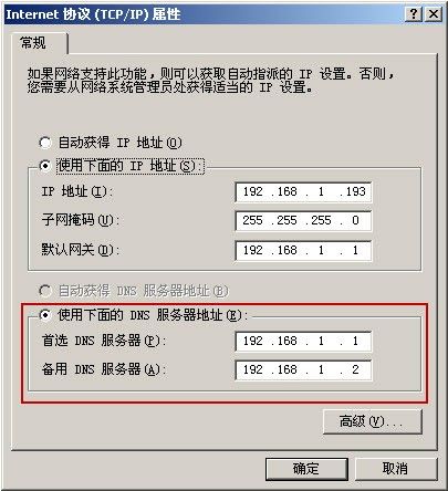 3) 在弹出的“Internet协议(协议/IP)”对话框中,选中“应用下面的DNS服务器地址”单选按钮,在“首选DNS服务器”编辑框中,输入DNS地址(如图 1?4)。
