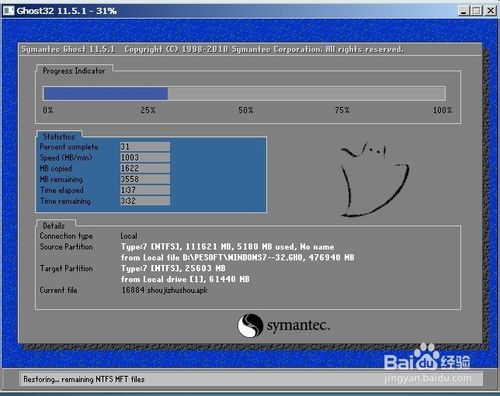4、然后开端进行安装,如下图,稍等一会,等进度条走完,盘算机会主动进行重启