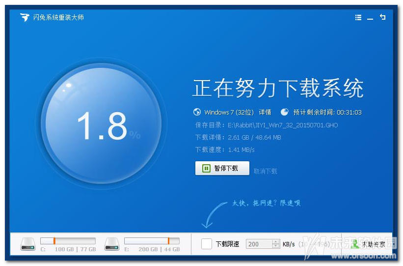 3、接着,闪兔系统重装大师工具接着会下载智能云匹配的操作系统,windows7系统下载大约需要30-60分钟,请耐心等候。如图三