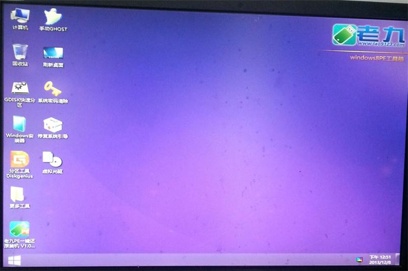 2.如上图所示,涌现两个选项,第一个为默认的从电脑本地系统启动,第二个则是老九一键急救系统;看到了吧?正如上面说的老九一键急救系统是在系统无法进入的时候能帮您掩护系统的;现在让我们选择到“老九一键急救系统”并按下回车键“Enter”进入;如下几张图所示为进入老九一键急救系统,这个急救系统其实就是win8PE系统;