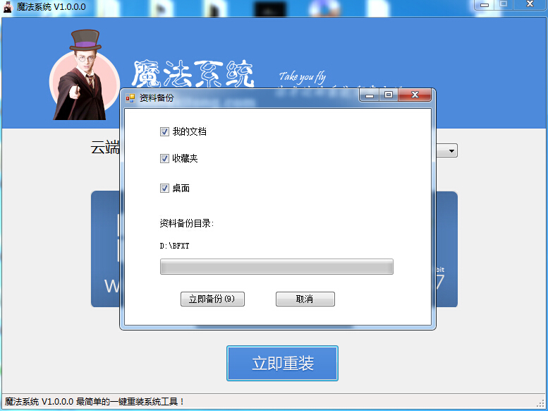 2.接着魔法系统会主动对您系统盘中的(一般系统盘为C盘)我的文档、收藏夹和桌面材料进行备份。备份的文件将会主动保存到您系统磁盘D盘分区中,名称为【D:\BFXT\】材料备份文件夹中。在下面的进度条中可以看到备份的进度,一般备份在1-2分钟之内就可以完成。具体时间要看你的材料多少决定,完成后会主动进入下一步。