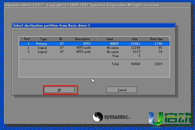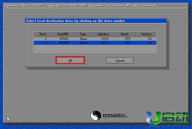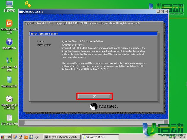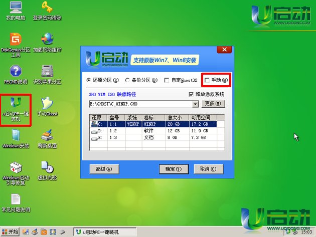 进入2003PE系统后,双击桌面上的“u启动PE一键装机”工具,勾选上方的“手动”选项,在程序主动跳转的窗口下点击“OK”按钮即可;如下图所示:
