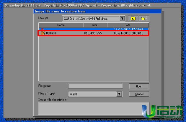 点击上方三角形符号,在涌现的下拉列表中选择事先放在u盘中后缀为.gho文件所在的地位后,点击选择.gho文件即可;如下图所示: