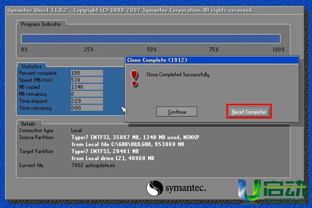 现在我们只需要等候系统主动解压,在涌现窗口提示时点击“reset computer”电脑便会主动重启并持续后续的安装。如下图所示: